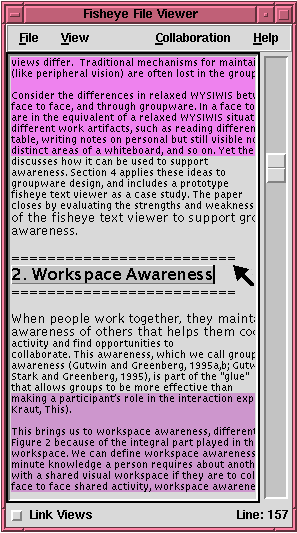 The fisheye text viewer has also been modified to cluster location information based on the document's semantic structure. For example, a code-viewing application places remote focal points on the name of the subroutine where that person is working, instead of showing the actual (and perhaps less meaningful) line of code.