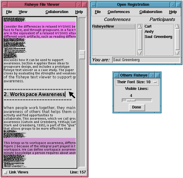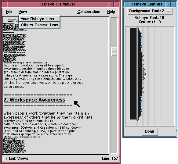 Groupware Fisheye. The fisheye text viewer is also a groupware system that lets multiple people view the same document. Each person's view is relaxed-WYSIWIS, allowing each individual to set their own focal point on the document.