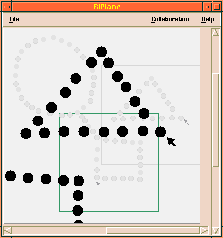 Single-User Head-Up Lens. As with most head-up displays, our lens provides a two-level view of the workspace. It is illustrated by the graphical editor in Figure 3. Like the Offset Lens, the global context shows the entire workspace, scaled to fit the size of the window exactly. The foreground shows the local detail which is a viewport onto a sub-area of the background global context. The location of the user's viewport onto the global workspace is controlled through scrollbars and other conventional interface mechanisms. The two primary differences between the Head-Up Lens and the Offset Lens are that, first, the Head-Up interface is simpler because there is no need to raise or position the lens, and second, the user is unable to edit the global context directly in the Head-Up system.