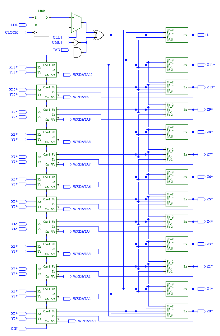The ALU and shifting network is made up of 12 ALU cells and 13 shift cells. Also included here is the link register and associated control logic.